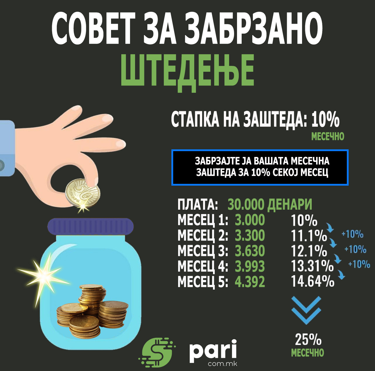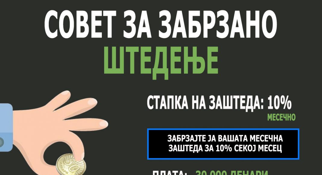 Ви даваме совет за забрзано штедење на вашата штедна сметка на приказот погоре. Постои непишано правило дека идеална заштеда би имале кога би штеделе по 10% од вашите месечни приходи. Илустративно ви претставуваме прогресивно штедење за 10% месечно, односно на редовните 10% од месечниот приход додавате дополнителни 10% на самата заштеда, така што ако првиот месец уплатите 3.000 денари, наредниот ќе треба да уплатите дополнителни 300 денари, односно вкупно 3.300 денари, за да во третиот месец уплатите дополнителни 330 денари на тие од претходниот месец или 3.630 денари… итн. Прогресивното штедење неосетно ви прави поголема заштеда за во иднина.