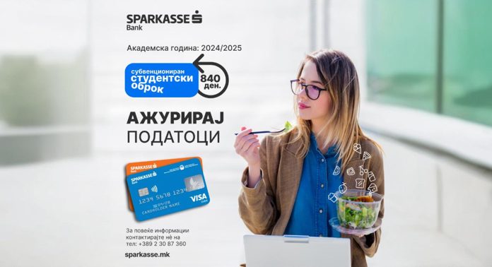 На онлајн платформата https://netbanking.mk/portal/studentportal на Шпаркасе банка во тек е ажурирање на податоците од корисниците на студентскиот оброк, по што ќе бидат изработени и издадени наменските Visa картичка. Тоа се однесува на студентите кои аплицирале на 13-от повик од Министерството за образование и наука за субвенциониран студентски оброк.