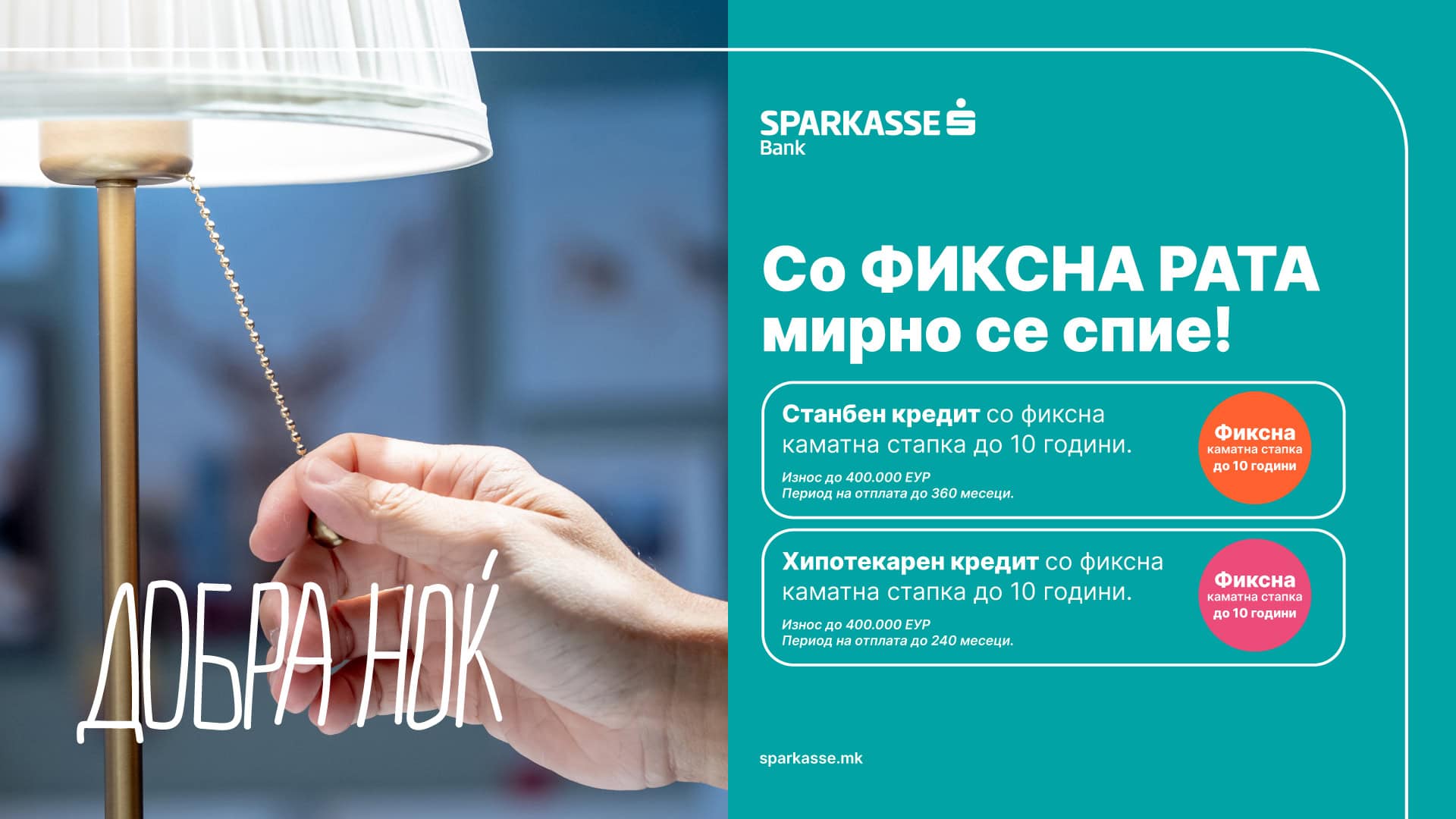 Потрошувачки кредит без хипотека, без жиранти и со фиксна каматна стапка за целиот период на отплата до 95 месеци е новиот продукт на Шпаркасе банка. Максималниот износ што може да се користи достигнува до 2.400.000 денари и е највисок на пазарот.