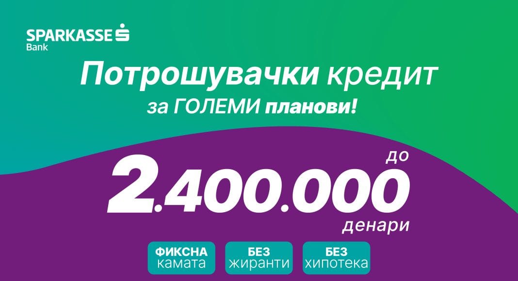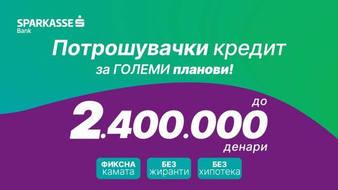 Потрошувачки кредит без хипотека, без жиранти и со фиксна каматна стапка за целиот период на отплата до 95 месеци е новиот продукт на Шпаркасе банка. Максималниот износ што може да се користи достигнува до 2.400.000 денари и е највисок на пазарот.
