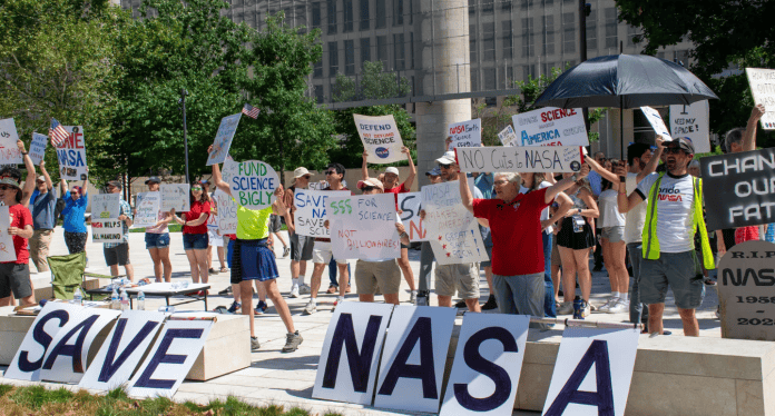 Демонстрантите, вклучувајќи ја и ад хок организациската група наречена НАСА има потреба од помош, се собраа за да го огласат алармот за она што го сметаат за широка, превентивна прекумерна усогласеност со предлогот за буџет на претседателот Доналд Трамп за 2026 година, кој го намалува научното портфолио на НАСА за приближно 50% – намалување што би откажало повеќе од 40 тековни и претстојни вселенски мисии. Додека предлогот за буџетот продолжува да се разгледува низ Конгресот, претставниците на НАСА на самиот врв на раководството на агенцијата се чини дека веќе почнале да спроведуваат намалувања, известувајќи ги вработените и изведувачите за претстојните намалувања на силата (RIF) и охрабрувајќи ги луѓето да ја искористат владината Програма за одложена оставка (DRP).
