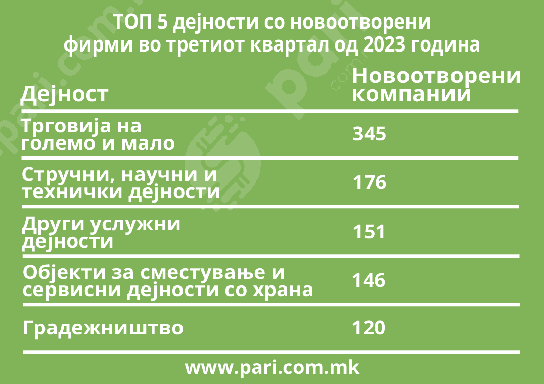 Во петте најдоминантни дејности има 938 нови фирми, или речиси половина од сите новоотворени фирми во третиот квартал од годинава. Тоа се дејностите: Трговија на големо и мало; Стручни, научни и технички дејности; Други услужни дејности; Објекти за сместување и сервисни дејности со храна; Градежништво.