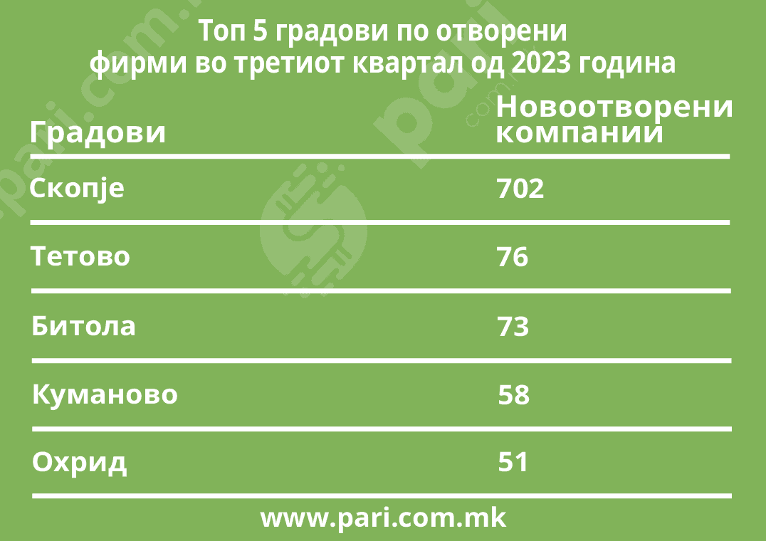 Во 5 градови: Скопје, Тетово, Битола, Куманово и Охрид, има вкупно 960 новоотворени фирми, или 52 насто од сите новоотворени фирми во третиот квартал од 2023 година. Логично, најмногу има во Скопје, дури 702 – што е 38 насто од сите новоотворени компании во државава.