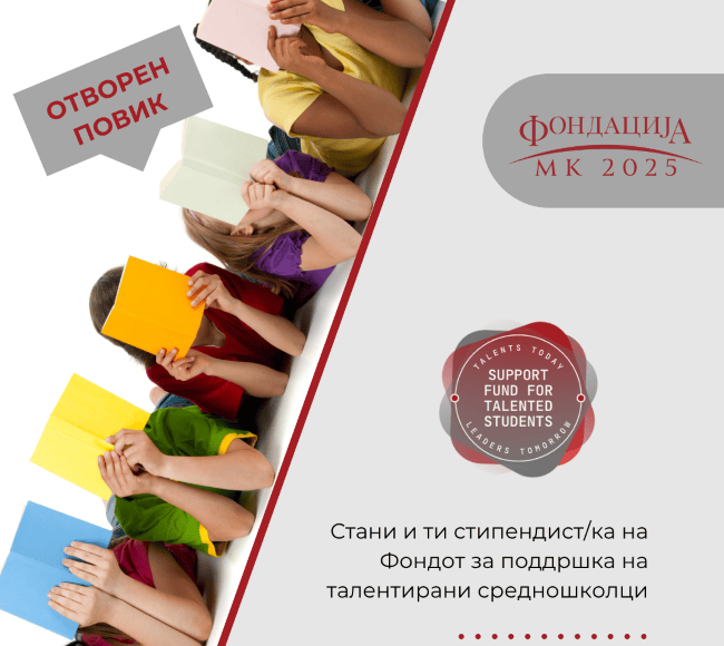 Фондацијата МК2025 го објавува повикот за прием на апликации за стипендии во склоп на Фондот за поддршка на талентирани средношколци “Таленти денес – лидери утре„ за тековната 2025/2026 година.