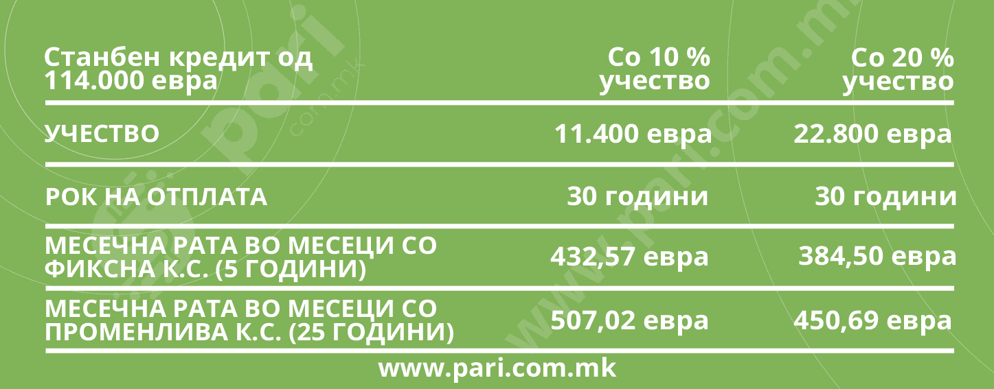 Помало учество при купување стан на кредит значи поголема месечна рата, а поголема месечна рата значи поголеми трошоци за станбениот кредит. На пример, нов стан од 60 метри квадратни во Скопје, според актуелните цени, чини 114.000 евра, ако се земе за просек 1.900 евра за метар квадратен.