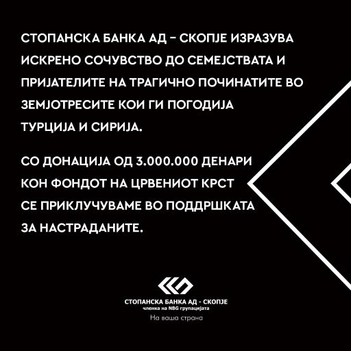Разорниот земјотрес што ги погоди Турција и Сирија однесе илјадници човечки животи и засекогаш ги смени животите на луѓето од двете земји. Стопанска банка АД – Скопје соопшти дека обезбеди финансиска поддршка од 3.000.000 денари за напорите кои Црвениот крст ги прави за помош на жителите во погодените подрачја.
