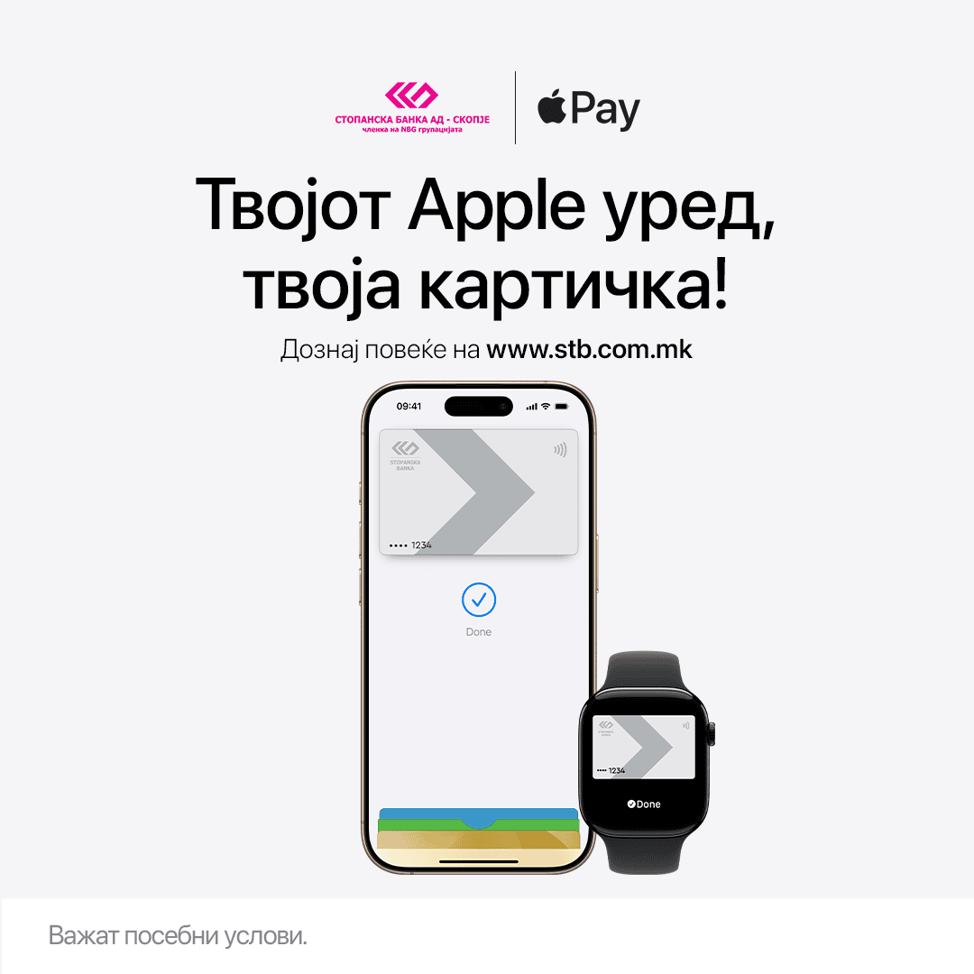 Стопанска банка од денеска на своите клиенти им го овозможува Apple Pay за брз, едноставен и безбеден начин на плаќање со своите Visa и MasterCard платежни картички користејќи Apple уред.