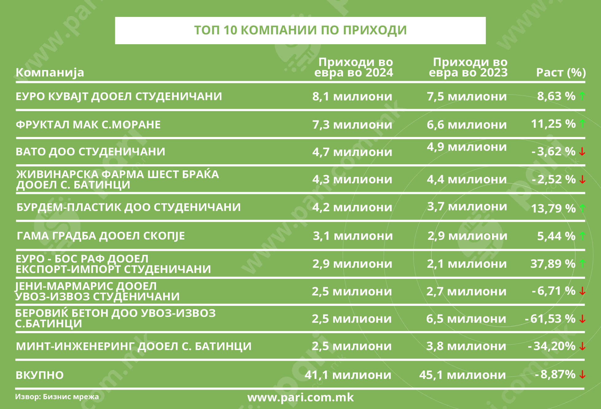 Највисоки приходи во 2024 година има Еуро Кувајт ДООЕЛ од Студеничани, позната по трговија на големо co дрва, градежен материјал и санитарна опрема. Таа остварила 8,1 милион евра, што е раст од 8,6 насто во однос на претходната година.