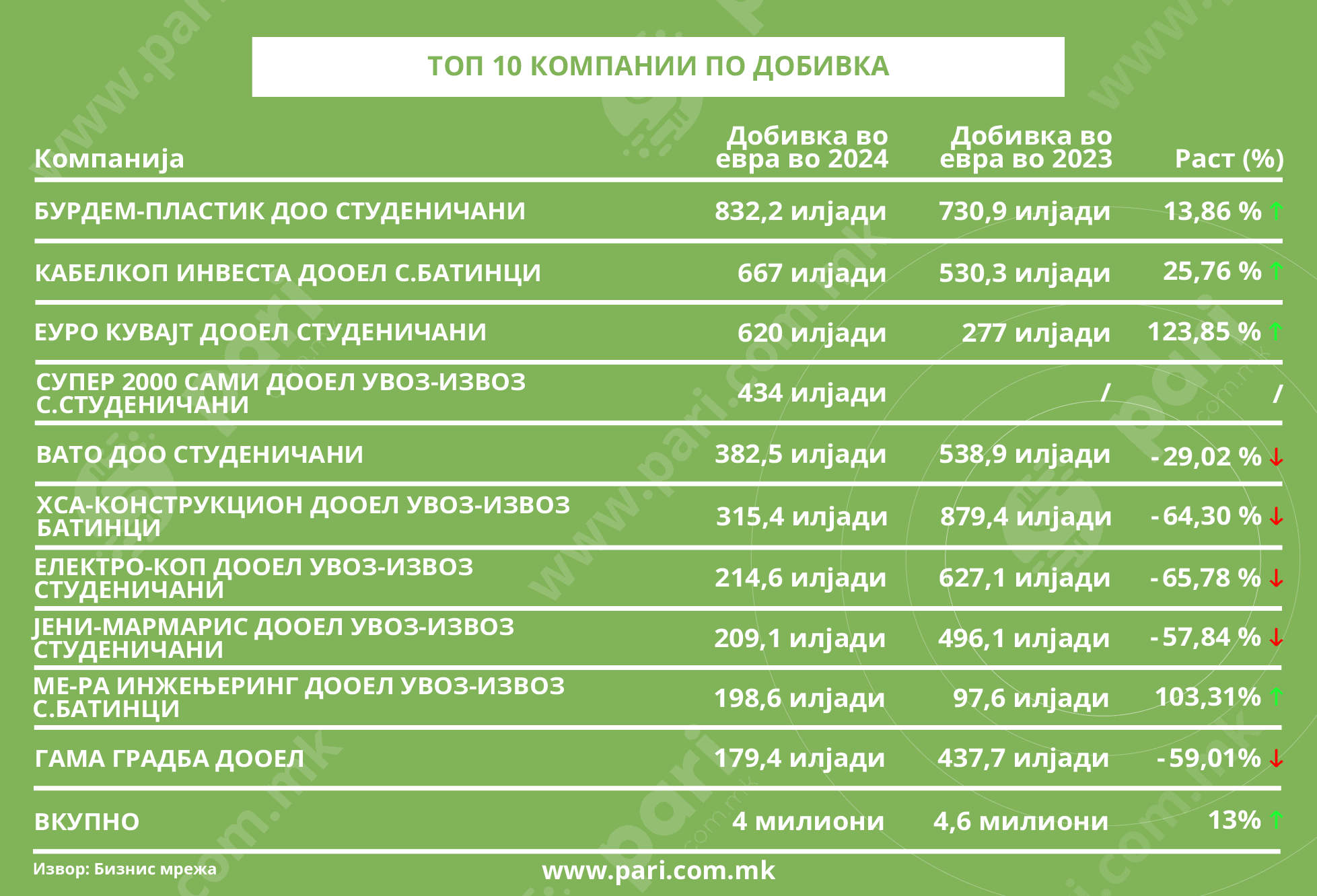 Ако приходите раскажуваат приказна за обем, тогаш добивките откриваат кои компании навистина знаат да управуваат ефикасно. На врвот по профитабилност за 2024 година е Бурдем-Пластик со 832,2 илјади евра. Добивката е зголемена за 13,86 насто во однос на лани. Потоа следи Кабелкоп Инвеста од Батинци, која остварува 667 илјади евра добивка и раст од 25,76 насто.