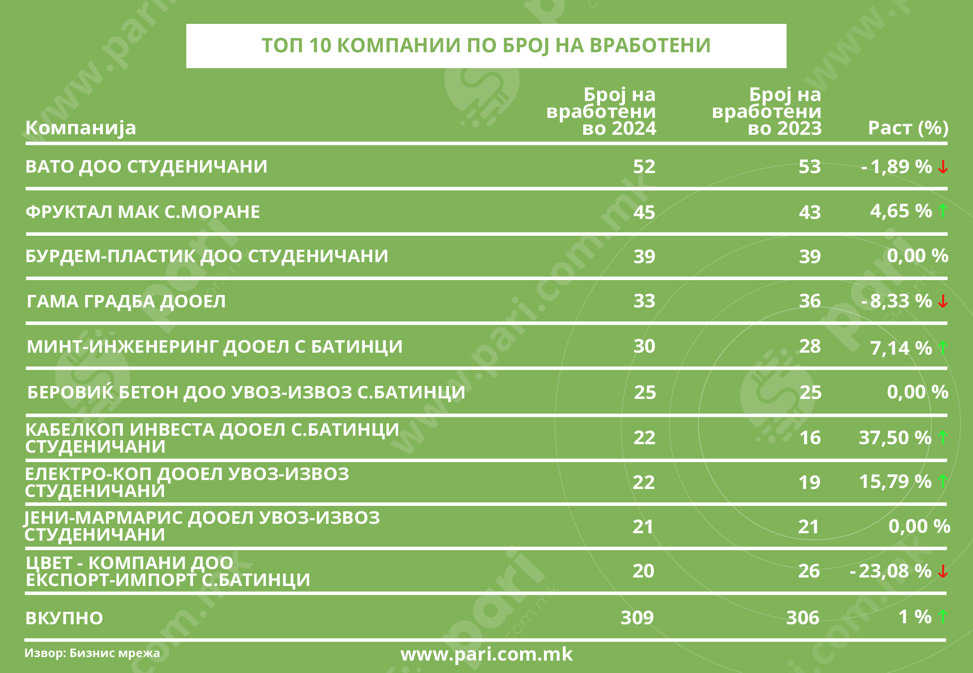 Кога станува збор за вработеноста, разликите се умерени. Најголем работодавач е Вато ДОО со 52 вработени, иако бележи благ пад од 1,89 насто. Следуваат Фруктал Мак со 45 и Бурдем-Пластик со 39 вработени.