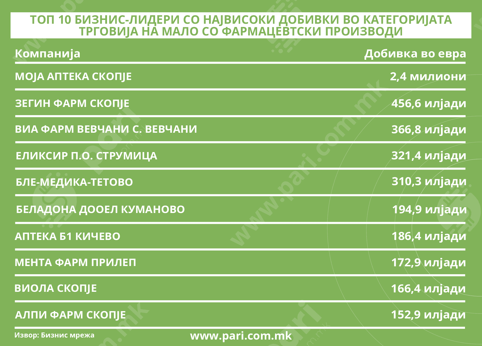 Анализата на порталот Пари, во која се користени податоците од Бизнис Мрежа, опфаќа 10 аптекарски фирми, кои се на врвот според приходот и добивката. Вкупно 192,8 милиони евра приходи, 4,7 милиони евра добивки и 2.010 вработени ја одразуваат силата и значењето на секторот трговија на мало co фармацевтски производи во македонската економија. Тоа е индустрија што постојано расте, балансирајќи меѓу здравјето на луѓето и стабилноста на пазарот.