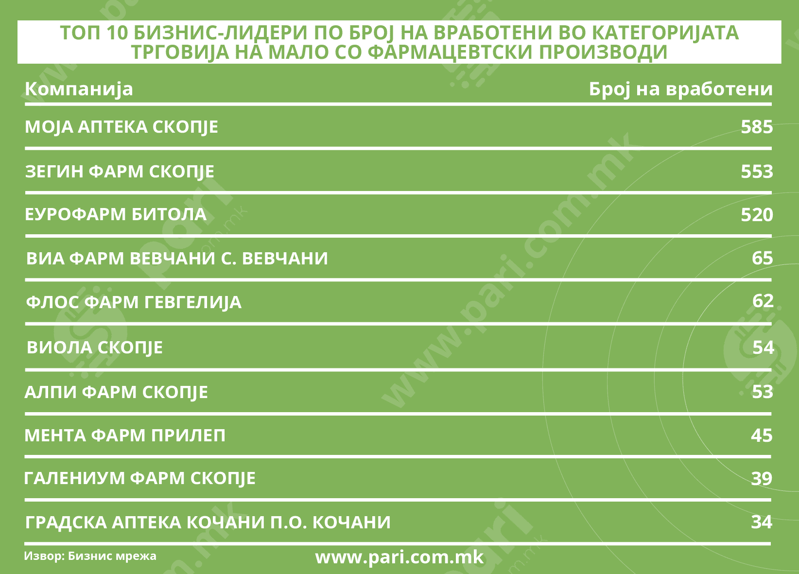 ТОП 10 БИЗНИС-ЛИДЕРИ ПО БРОЈ НА ВРАБОТЕНИ ВО КАТЕГОРИЈАТА ТРГОВИЈА НА МАЛО СО ФАРМАЦЕВТСКИ ПРОИЗВОДИ