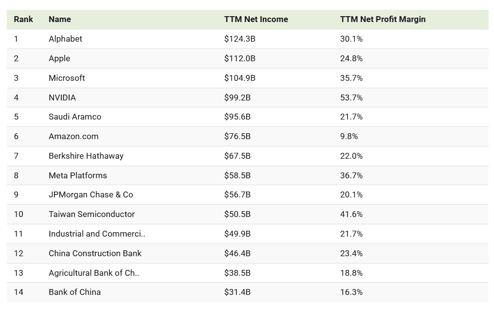 Како и во претходните години, технолошките фирми доминираат на врвот на ранг-листата, при што Alphabet заработува 124,3 милијарди долари, а Apple и Microsoft се веднаш зад нив. Овие компании имаат корист од дигитални услуги со висока маржа, рекламни платформи и софтвер за претпријатија, сите кои ефикасно се скалираат.