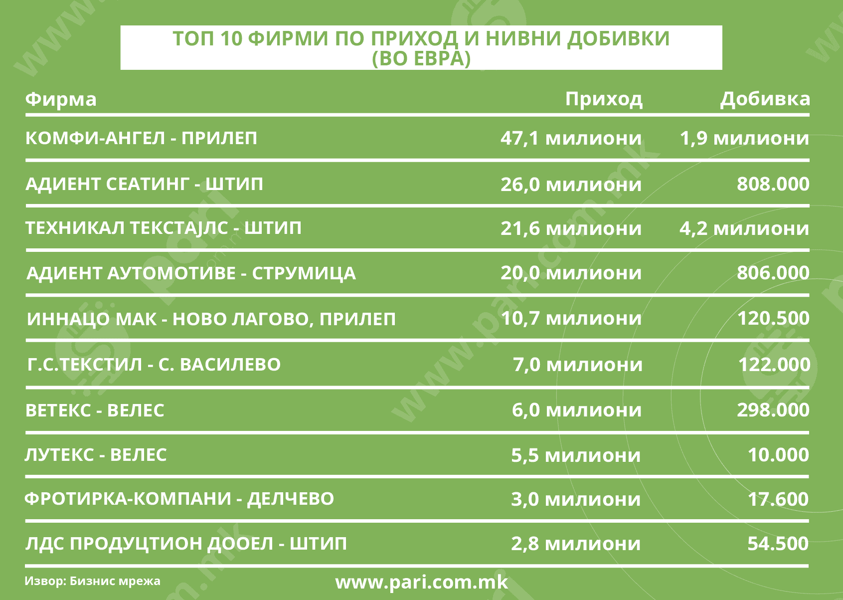 ТОП 10 фирми по приход, нивни добивки и просечни плати (во евра)