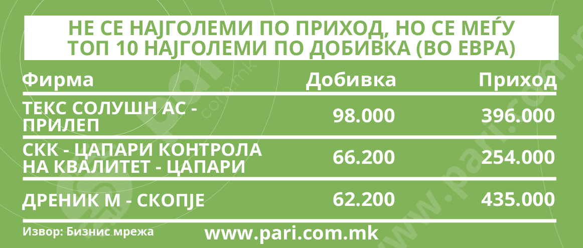 Меѓу десетте најголеми компании по добивка се и прилепскиот ТЕКС СОЛУШН АС, СКК ‒ ЦАПАРИ КОНТРОЛА НА КВАЛИТЕТ од битолското село Цапари и ДРЕНИК М ДООЕЛ од Скопје.