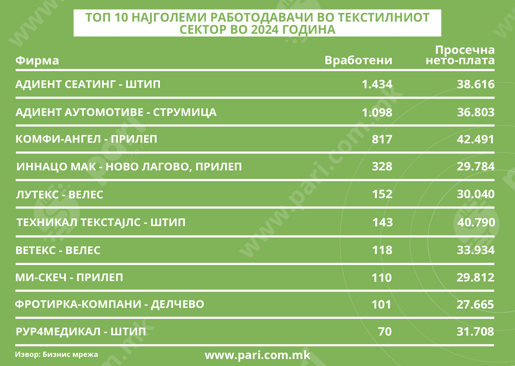 Според податоците од Бизнис мрежа, не постои фирма од најголемите работодавачи во која просечната плата е намалена, или останала иста во 2024 година во однос на 2023 година. Зголемувањата се различни, но неретко и двоцифрени. Од друга страна, бројот на вработени се намалил. Така, вкупниот број на вработени кај десетте најголеми работодавачи во 2024 година бил 4.371, а во 2023 година кај истите тие работодавачи имало 4.466 вработени, односно 95 луѓе плус.