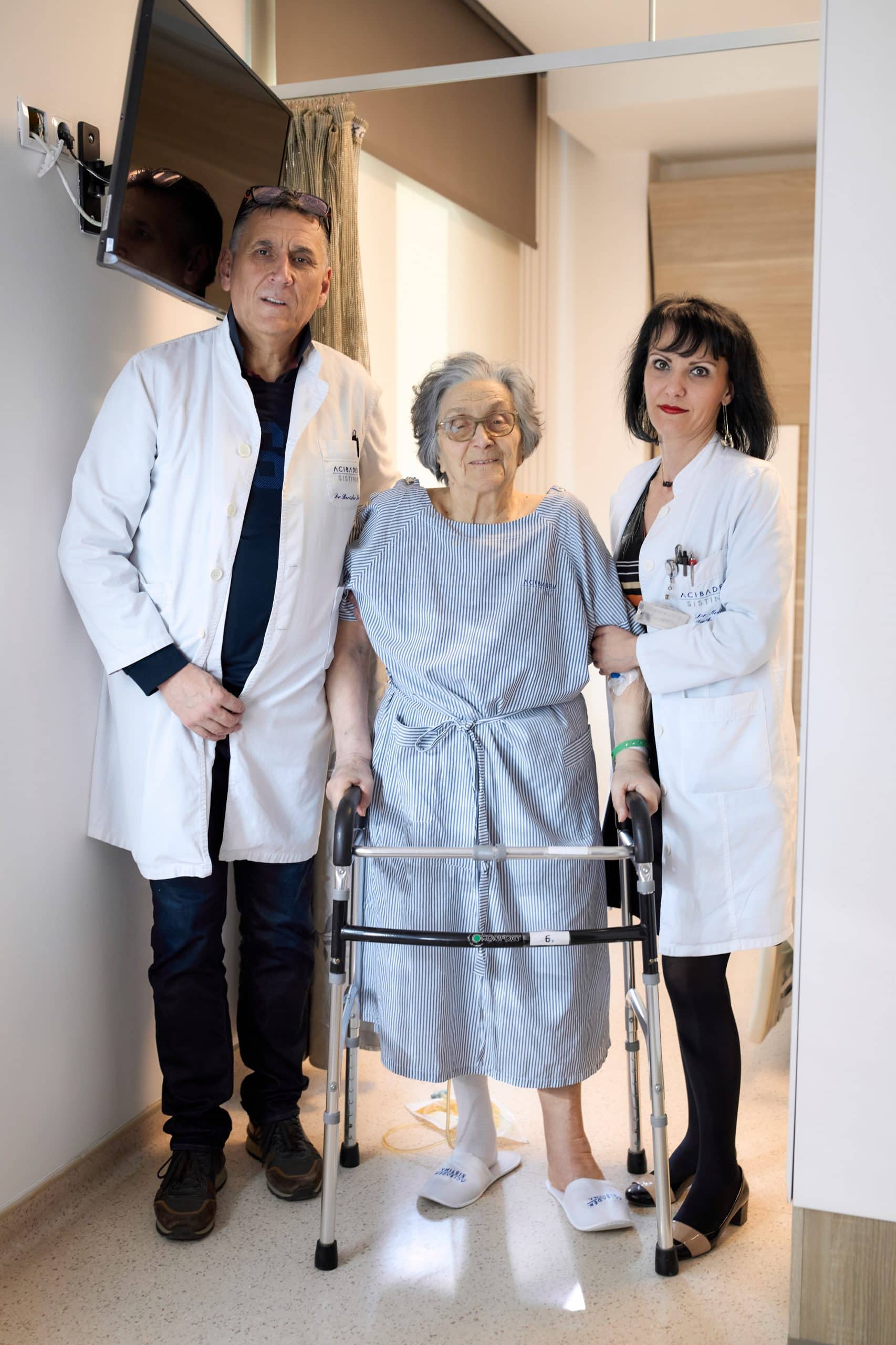 „Снежана веќе вториот ден по операцијата, со помош на нашите физиотерапевти и со одалка, беше вертикализирана со минимално оптоварување на оперираната нога. Постоперативно се планира терапија, вежби за зајакнување на мускулатурата и постепено осамостојување при движење, со користење на помагало при одење во наредните 2-3 месеци“ – објаснува д-р Илиев.