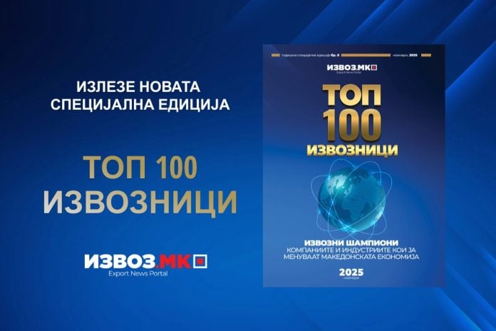 Специјализираниот портал ИзвозМК ја издаде шестатa по ред специјална едиција „ТОП 100 ИЗВОЗНИЦИ 2025”, единствената публикација што ги рангира најголемите и најуспешни извозни компании во Северна Македонија.