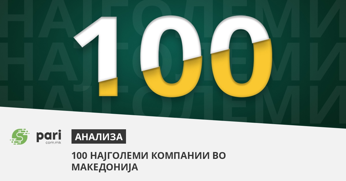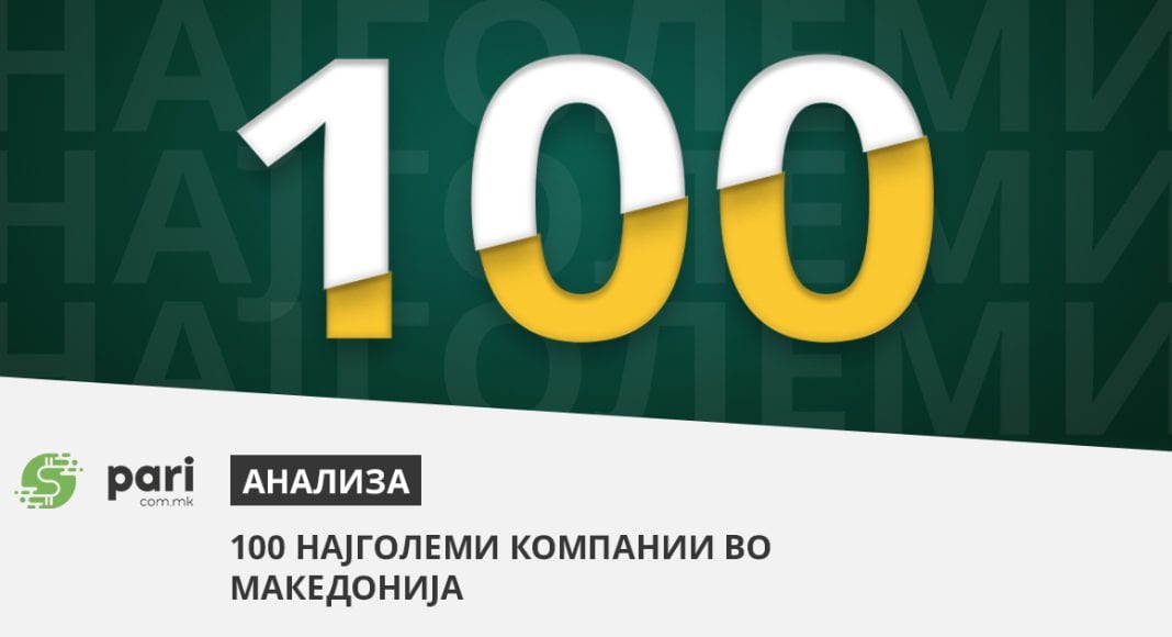 Порталот „Пари“ во соработка со БизнисМрежа.мк и Таргет груп почнува да го објавува серијалот за 100-те најголеми компании во државата. На увид на јавноста ќе бидат претставени најмоќните компании во државата од кои зависи економијата. Ви напоменуваме дека предмет на рангирањето на 100 НАЈГОЛЕМИ се компаниите – трговски друштва во приватна сопственост. Ранг листата не вклучува правни лица, банки, осигурителни компании, државни институции, компании во државна сошственост и останати правни лица кои не се регистрирани согласно законот за трговски друштва.