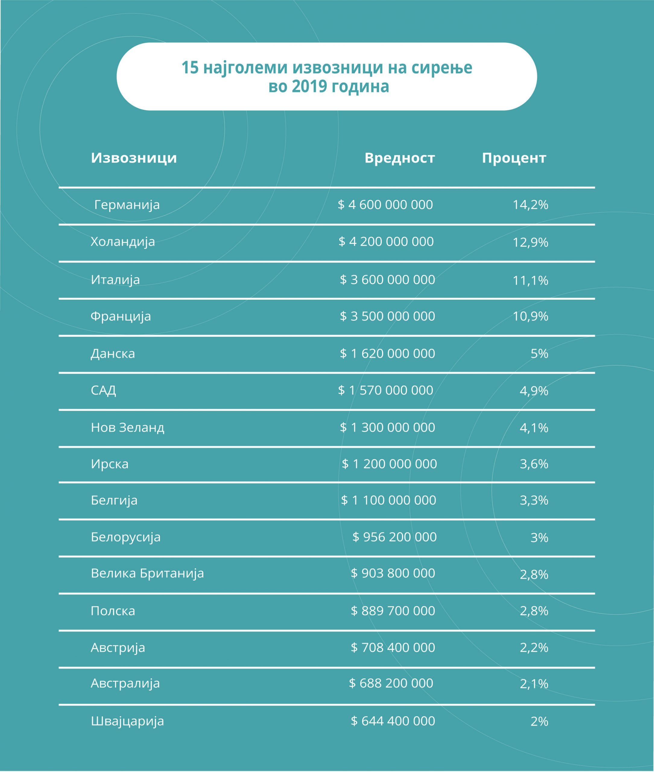 Наведените 15 земји испорачаа 85% од глобалното сирење извезено во 2019 година по вредност.