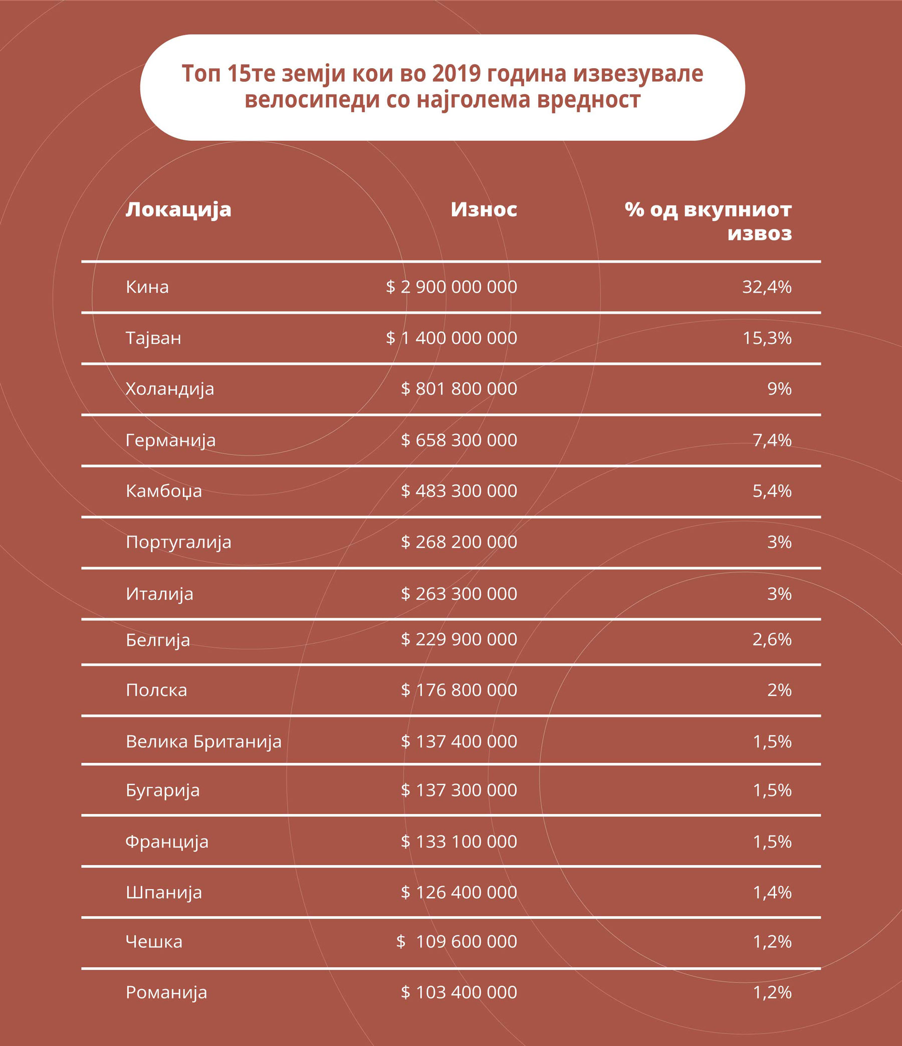 Ви ги претставуваме ТОП 15-те земји кои во 2019, година извезувале велосипеди со најголема вредност: