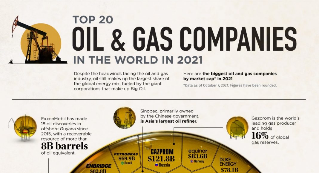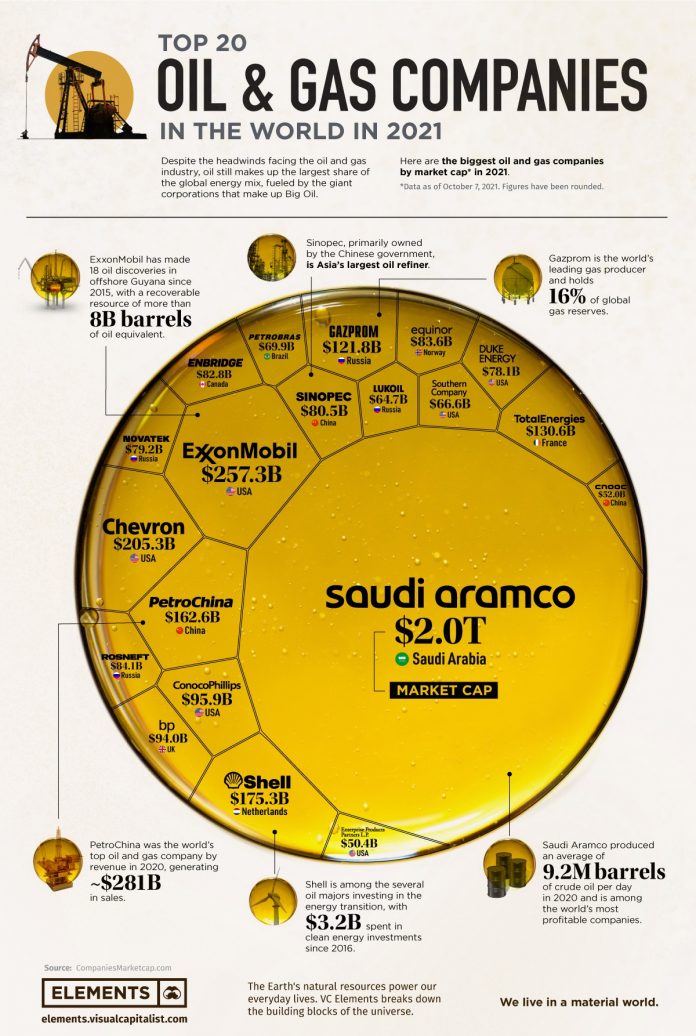 Користејќи ги податоците од CompaniesMarketCap.com, инфографикот што следи ги рангира 20-те најголеми нафтени и гасни компании по пазарна капитализација заклучно со 7 октомври 2021 година.