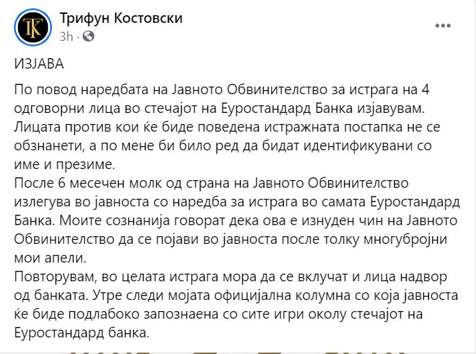 Лицата против кои ќе биде поведена истражната постапка не се обзнанети, а по мене би било ред да бидат идентификувани со име и презиме, вели бизнисменот и поранешен мнозински акционер на пропаднатата Еуростандард банка, Трифун Костовски во писмена изјава објавена на Фејсбук профилот.