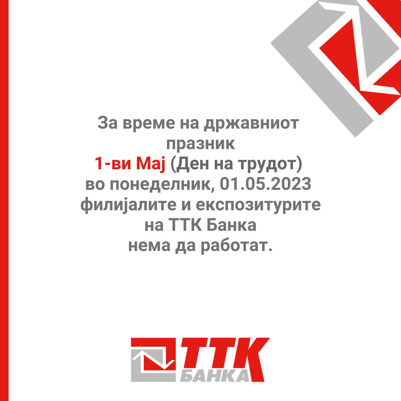 ТТК Банка ги известува своите ценети клиенти дека за време на претстојниот државен празник – „1-ви Мај – Ден на трудот ” , на 1.5.2023 година (понеделник), филијалите и експозитурите на ТТК Банка АД Скопје нема да работат.