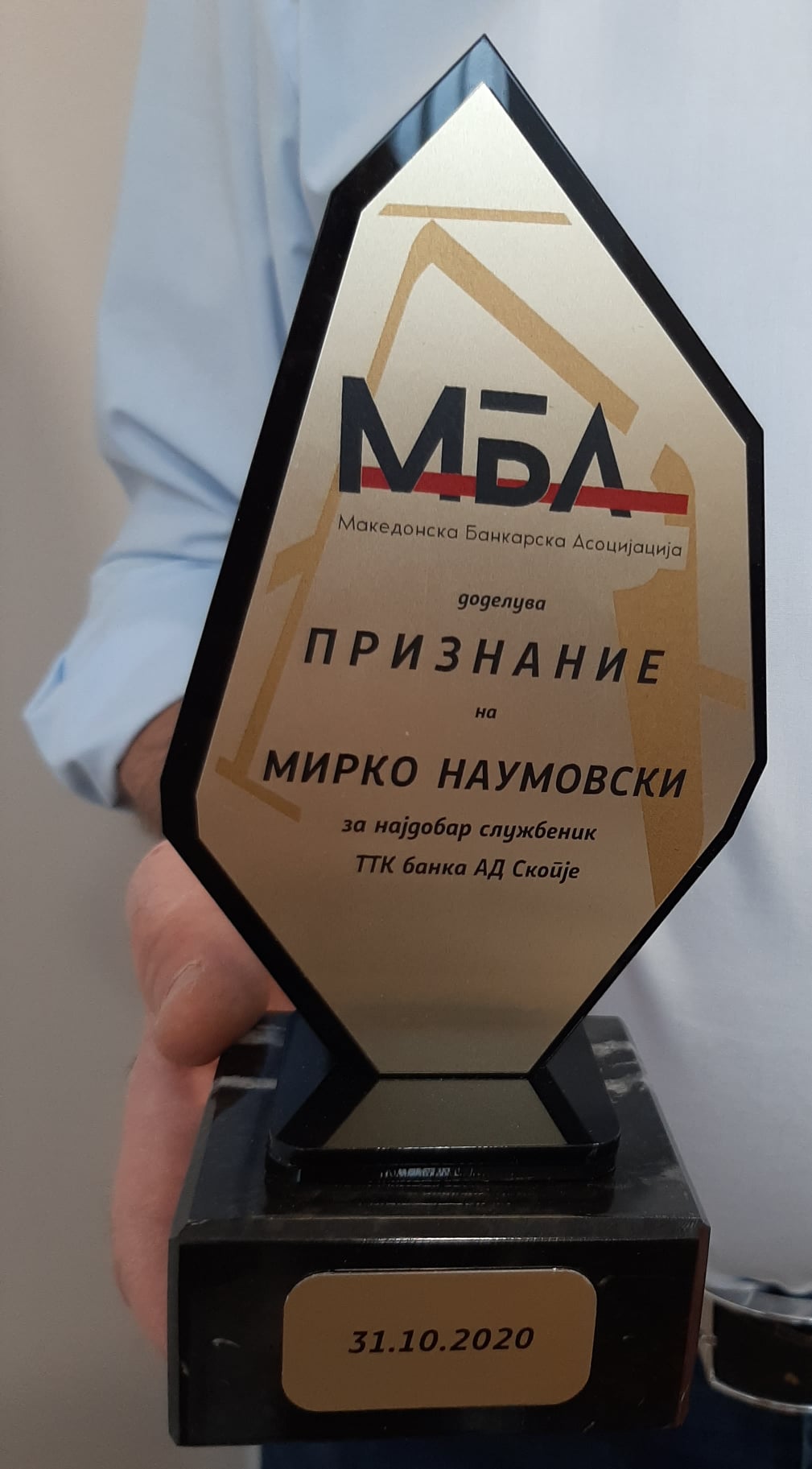 Доделено признание за најдобар банкарски службеник на ТТК Банка АД Скопје од страна на Македонската банкарска асоцијација!