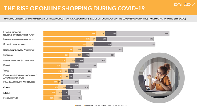 Во продолжение следуваат податоци од неколку развиени пазари кои покажуваат колкав процент на луѓе се префрлиле на онлајн купување во различни категории, само заради пандемијата на КОВИД-19.