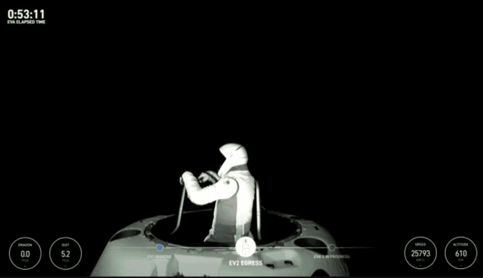 Двајца приватни астронаути од капсулата SpaceX ја изведоа првата приватна вселенска прошетка во светот, со што станаа првите двајца цивили кои спроведоа таква вселенска мисија. Милијардерот Џаред Ајзакман (41) и инженерката на SpaceX, Сара Гилис (30) го направија ризичниот маневар поврзан со вселенското летало Crew Dragon во вакумот од вселената стотици милји од Земјата. додека други двајца гледале од внатре. Џеред Ајзакман и Сара Гилис излегоа од вселенското летало Спејс Икс со разлика од околу 15 минути, со почеток во 11:52 часот по средноевропско време, облечени во специјално дизајнирани одела.