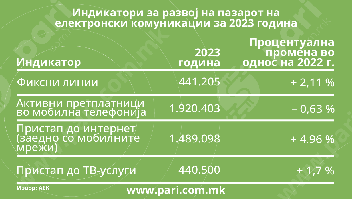 Минатата година сме имале 1.920.403 активни претплатници/линии во мобилна телефонија. Ако се земат предвид податоците од Државниот завод за статистика за проценетото население на 31 декември 2023 година, според кои броиме 1.829.954 жители, излегува дека бројот на претплатничките линии е поголем од бројот на населението за солидни 90.449 линии. Не е ни чудо ако се знае дека многумина немаат само еден, туку повеќе телефони, а мобилни телефони им се купуваат и на деца од рана возраст.