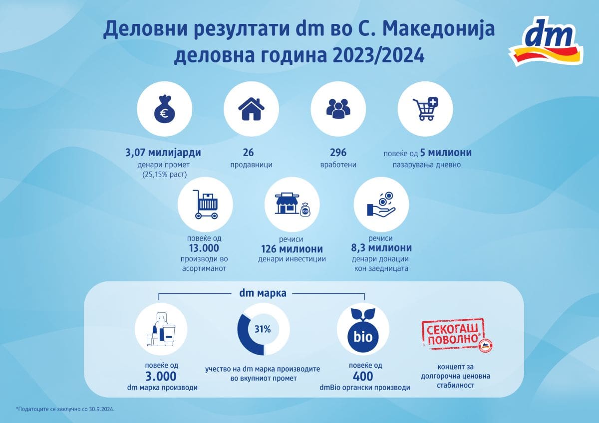 Компанијата dm drogerie markt постигна извонредни деловни резултати во деловната 2023/24 година. Со остварен промет од 3,07 милијарди денари, односно раст од 25,15 отсто, инвестиции во износ од речиси 126 милиони денари во својата продажна мрежа, како и раст на фреквенцијата на пазарување од окoлу 16 отсто, најголемиот дрогериски синџир постигна напредок во сите клучни области и ја зајакна својата позиција на македонскиот пазар.
