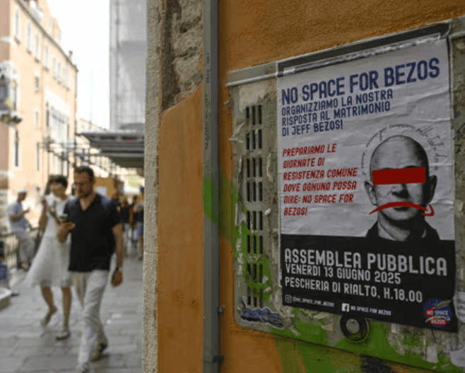Активистите ја засилија својата кампања „Нема место за Безос“ откако Луиџи Бруњаро, милионерот градоначалник на Венеција, потврди во март дека двојката ќе се венча во градот.