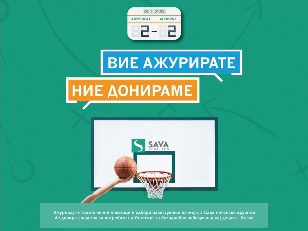“ВИЕ АЖУРИРАТЕ, НИЕ ДОНИРАМЕ” гласи слоганот на хуманитарната иницијатива на Сава пензиско друштво, која втора година по ред има за цел формирање фонд за донација. Оваа година средствата ќе бидат наменети за потребите на Институтот за белодробни заболувања кај децата – Козле.