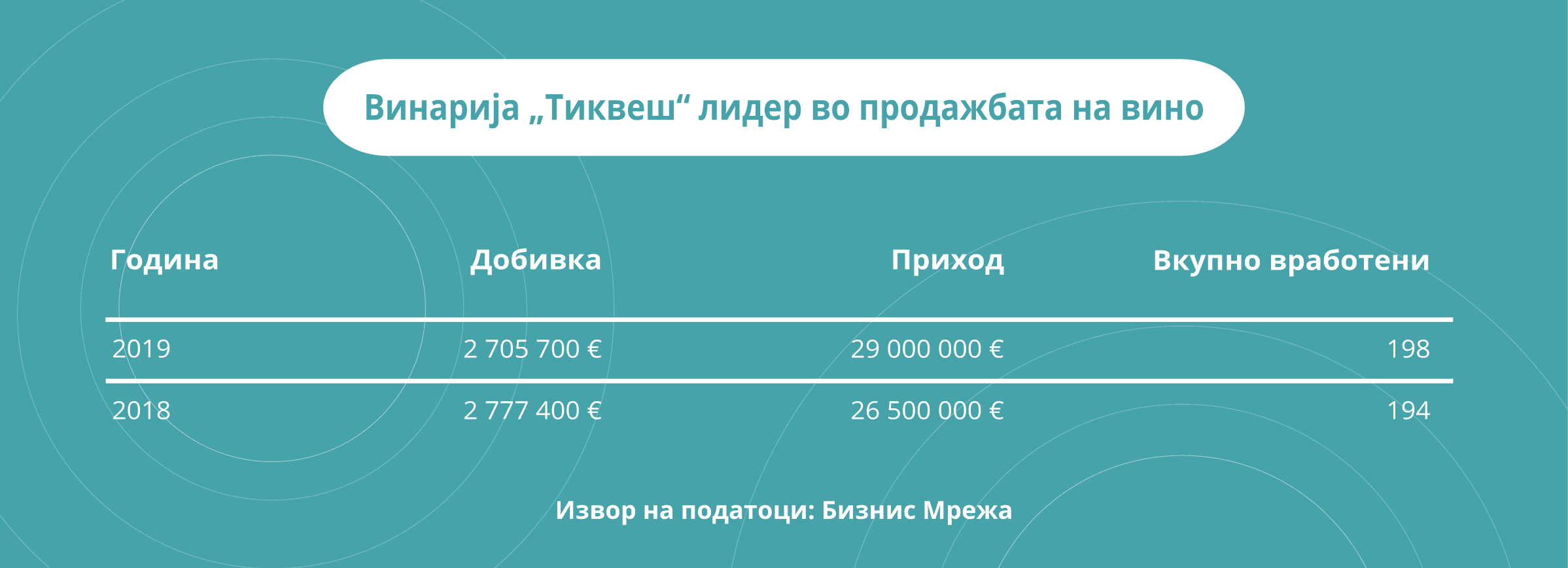 Минатата година, исто како и во 2018 година винаријата „Тиквеш“ ги има направено најголемите приходи и добивки. Односно, дури 43,7 отсто од приходите што ги прават десетте најголеми винарии отпаѓа на приходи направени во оваа кавадаречка винарска визба.
