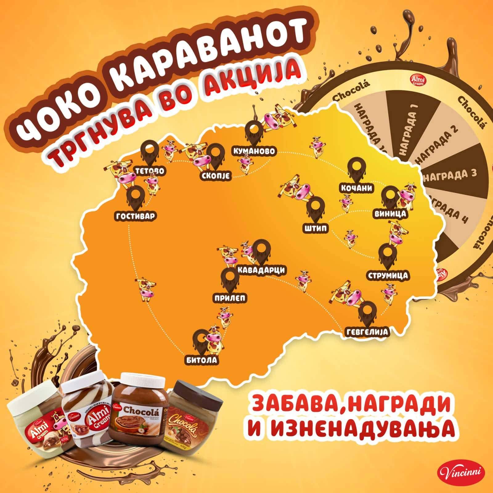Со цел производите повеќе да се доближат до крајните потрошувачите, како и одблиску да ги запознаат истите со нивните вкусови, Макпрогрес започна интересна и забавна маркетинг кампања “Стопи се со Алми ” и “Чоколадирај се со Чокола “. За промоција на оваа кампања се организира Чоко Караван во повеќе супер маркети низ Македонија каде потрошувачите имаат прилика да ги вкусат производите, да се забавуваат со наградното чокладно тркало и да добијат доста атрактивни награди.