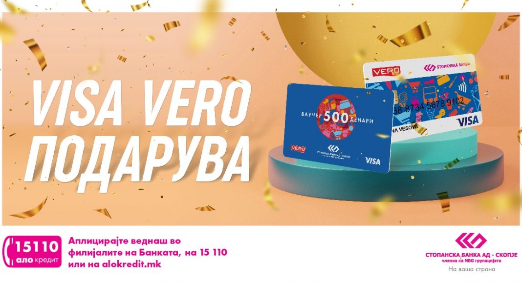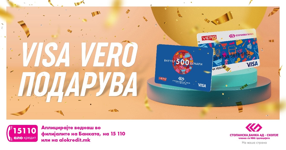 Подарок ВАУЧЕР ЗА ПОПУСТ од 500 денари за првите 1.000 нови корисници на VISA VERO кредитна картичка на Стопанска Банка во 2021 година. Ваучерот за попуст може да се искористи при плаќањето со VISA VERO кредитната картичка во ВЕРО и ЏАМБО маркетите низ државата.