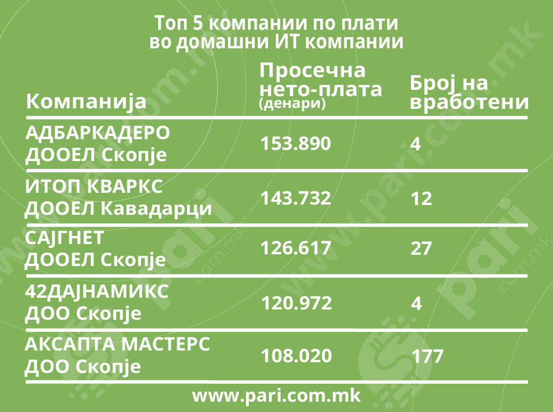 Петте најголеми домашни ИТ компании работно ангажираат 684 лица. Кај нив платите се движат од 36.626 денари (што е мала плата за ИТ индустријата) до 108.020 денари