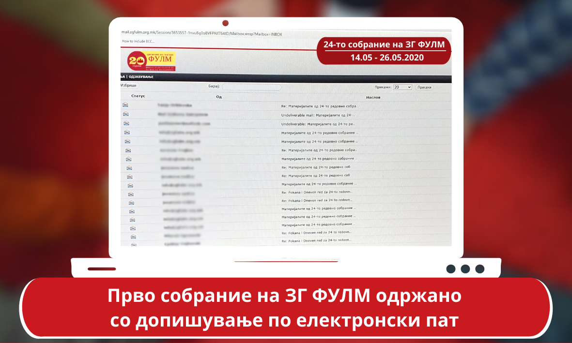 Поради мерките поврзани со спречување на ширење на Корона вирусот, ЗГ ФУЛМ после 23 години, во 2020 година за прв пат го одржа Редовното Собрание со допишување по електронски пат. Сите материјали, предлози, коментари и прашања беа праќани електронски и благодарение на нашите членови успешно го оддржавме нашето прво електронко собрание.