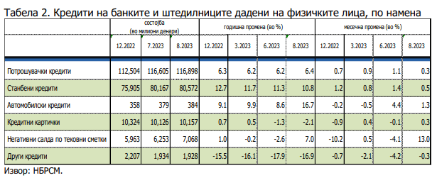 Од аспект на намената, потрошувачките и станбените кредити, кои се и најзастапени, се со месечно зголемување од 0,3 и 0,5 насто, а на годишно ниво – 6,4, односно 10,8 проценти. Конкретно, потрошувачките кредити во август достигнале 116,898 милиони денари речиси 2 милијарди евра, а станбените – 80,572 милиони денари 1,3 милијарди евра