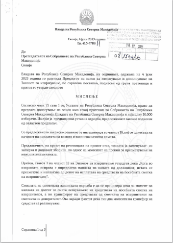 Владата испратило негативно мислење за веќе усвоените измени на Законот за извршување со кој се запира наплата на камата кога таа ќе ја достигне висината на долгот. На седницата на 04.07.2023 година Владата донела мислење дека измените на Законот за извршување сериозно го нарушува концептот на владеење на правото во државава и затоа Собранието не би требало да ги усвои.