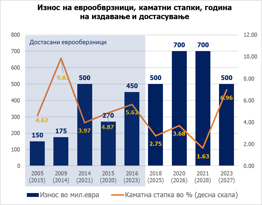 Во наредните години, односно од 2025-2028 година достасува за исплата пазарен надворешен долг од вкупно 2,4 милијарди евра, износ на издадените еврообврзници на оваа Влада. Ова значи или скапо рефинансирање, во услови кога каматните стапки растат и ќе бидат најверојатно на високо ниво одреден период, или силна фискална консолидација, која значи резови во Буџетот на трошењата и собирање на повеќе приходи. Владата не се одлучи за резови во своите трошења, напротив си троши нерационално и коруптивно, ама затоа се реши да го зголеми ДДВ на 1.600 призводи и да воведе данок на солидарност за успешните фирми. Никако да се реши да ги гони неплаќачите на даноци, неплаќачите на сметки за струја итн, но се реши да ги амнестира сите кои го уништија државниот Буџет.