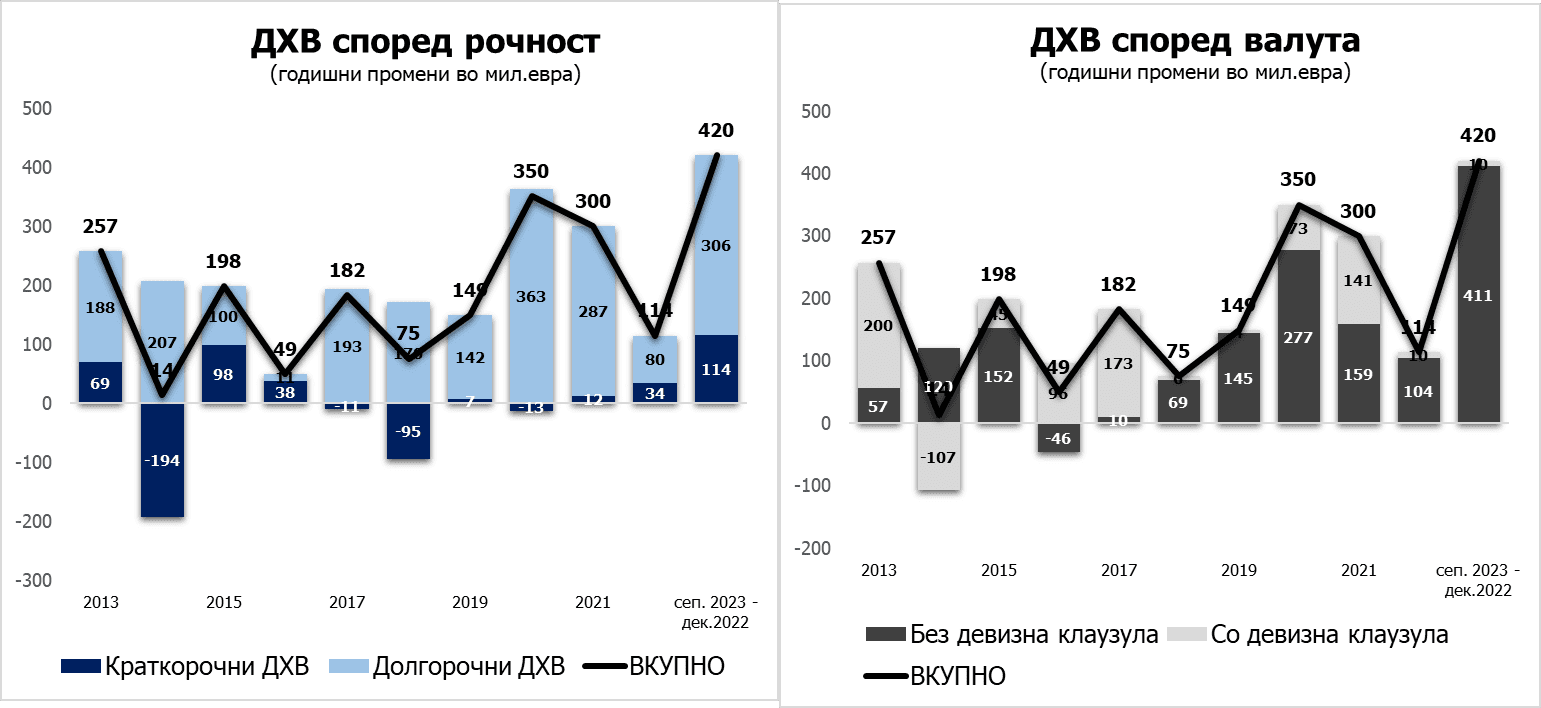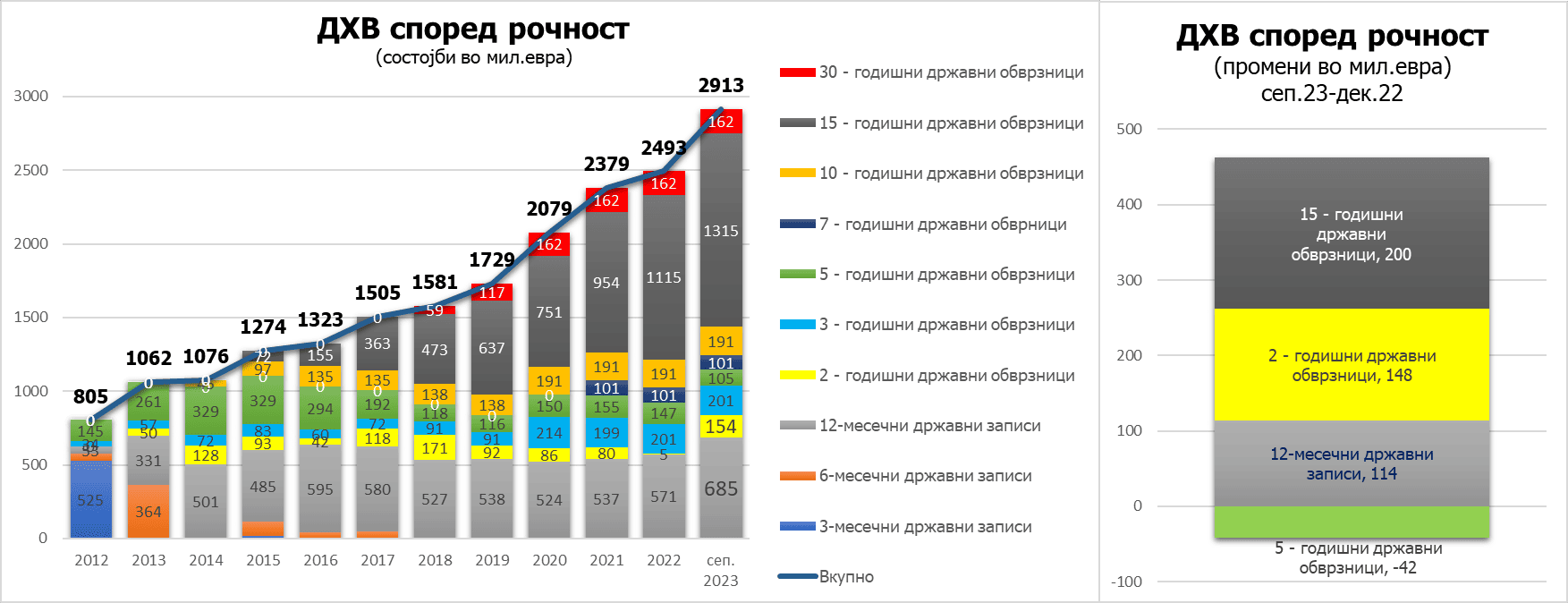 Ова силно темпо на задолжување т.е растот на домашниот долг од 420 милиони евра за само девет месеци е историски највисок, дури повисок и од растот во цела 2020 година за време на ковид кризата. Државата од почетокот на година се задолжува главно преку денарски ДХВ, имајќи предвид дека интересот е поголем заради повисоките каматни стапки од оние со девизна клаузула. Рочноста на новите запишани ДХВ е во полза на долгорочните, но загрижува растот на трезорски записи од 114 мил.евра (12 месечни ДХВ) и на двегодишните обврзници од 148 мил.евра. Ова значи дека вкупно 264 мил.евра ќе достасаат за две години. Каматната стапка на 12 месечните трезорски записи изнесува 4,25%, а на двегодишните обврзници 5,25% и 5,0%. За споредба, на 15 годишните државни обврзници изнесува 6,15%. Власта со ова си купува скапи пари за време на последниот нивен мандат.