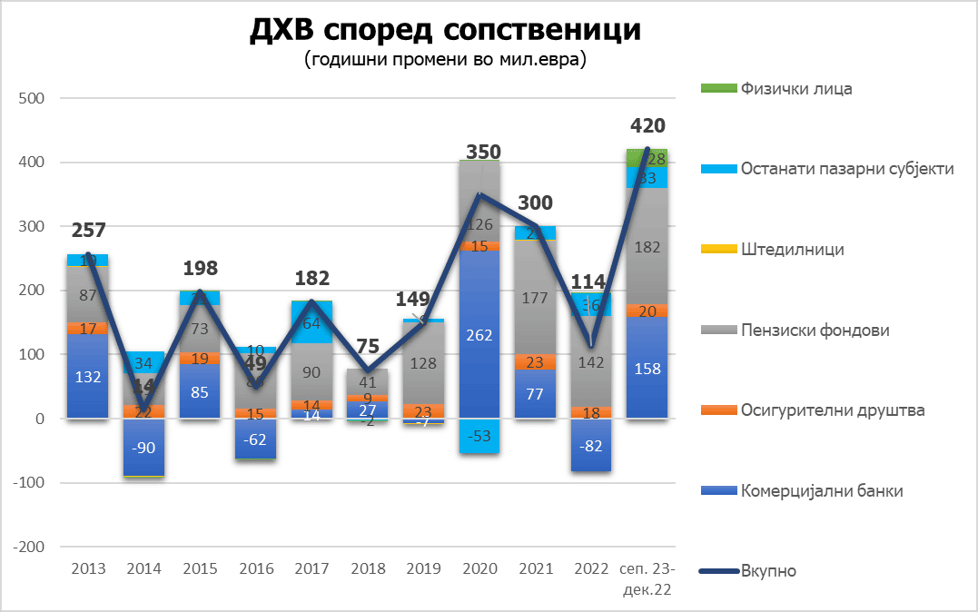 И кој купува државни хартии од вредност? Нормално е да се инвестира при вакви високи каматни стапки. Приватните пензиски фондови во последите неколку години се најзначаен инвеститор, што во дел заради регулаторни барања, што во дел заради усогласување на билансната структура. Потоа се домашните банки, кои имаат регулаторни барања да држат одреден дел од средствата во ликвидна актива (ДХВ го имаат тој третман) и заради тековните вишоци на ликвидност. Осигурителниот сектор исто инвестира, а физичките лица за прв пат по долги години пласираа околу 28 мил.евра, и тоа 10 мил. евра во граѓанската обврзница и остатокот во други ДХВ.