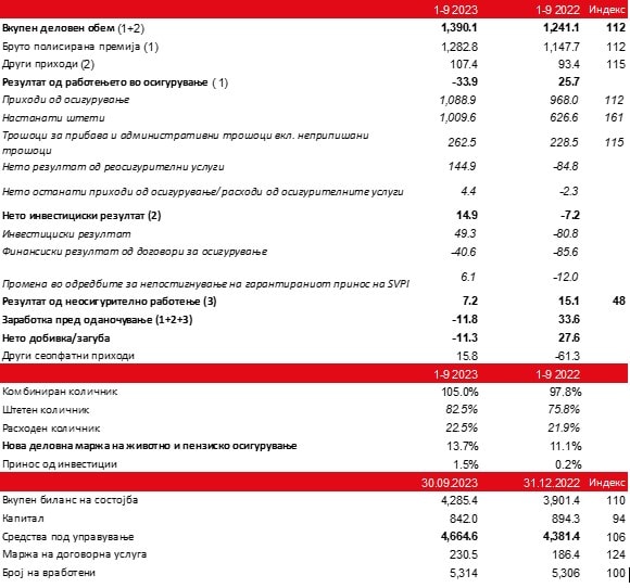 - Деловниот резултат од осигурување е негативен и изнесува -33,9 милиони евра (25,7 милиони евра минатата година). Сегментите Живот и пензии остварија добри резултати, додека сегментите Имот и Здравство забележаа загуба поради зголемениот обем и интензитет на штети и регулирање на цените на дополнителното здравствено осигурување. Приходите од осигурителните услуги се зголемени за 12 отсто, на 1.088,9 милиони евра, пресметаните штети за 61 отсто, на 1.009,6 милиони евра, а трошоците за стекнување на осигурување, административните и неприпишаните трошоци за 15 отсто, на 262,5 милиони евра.