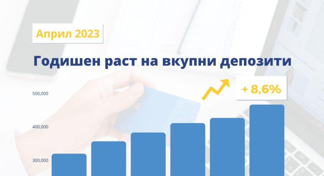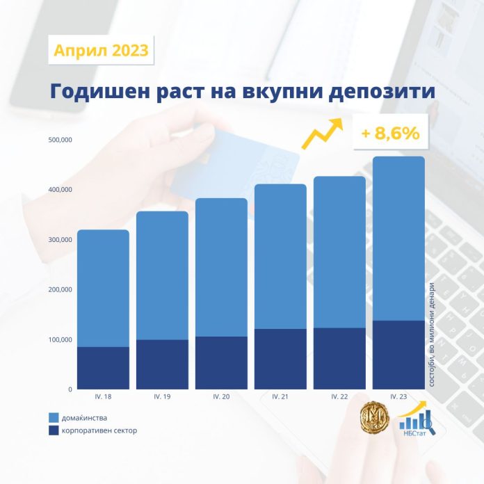 Во април депозитите се зголемиле за 1,3 проценти на месечна основа. Во тоа придонес имаат граѓаните, но предничи корпоративниот сектор. Сепак, годишно, во остварената стапка раст од 8,6 насто доминантни се заштедите на населението.