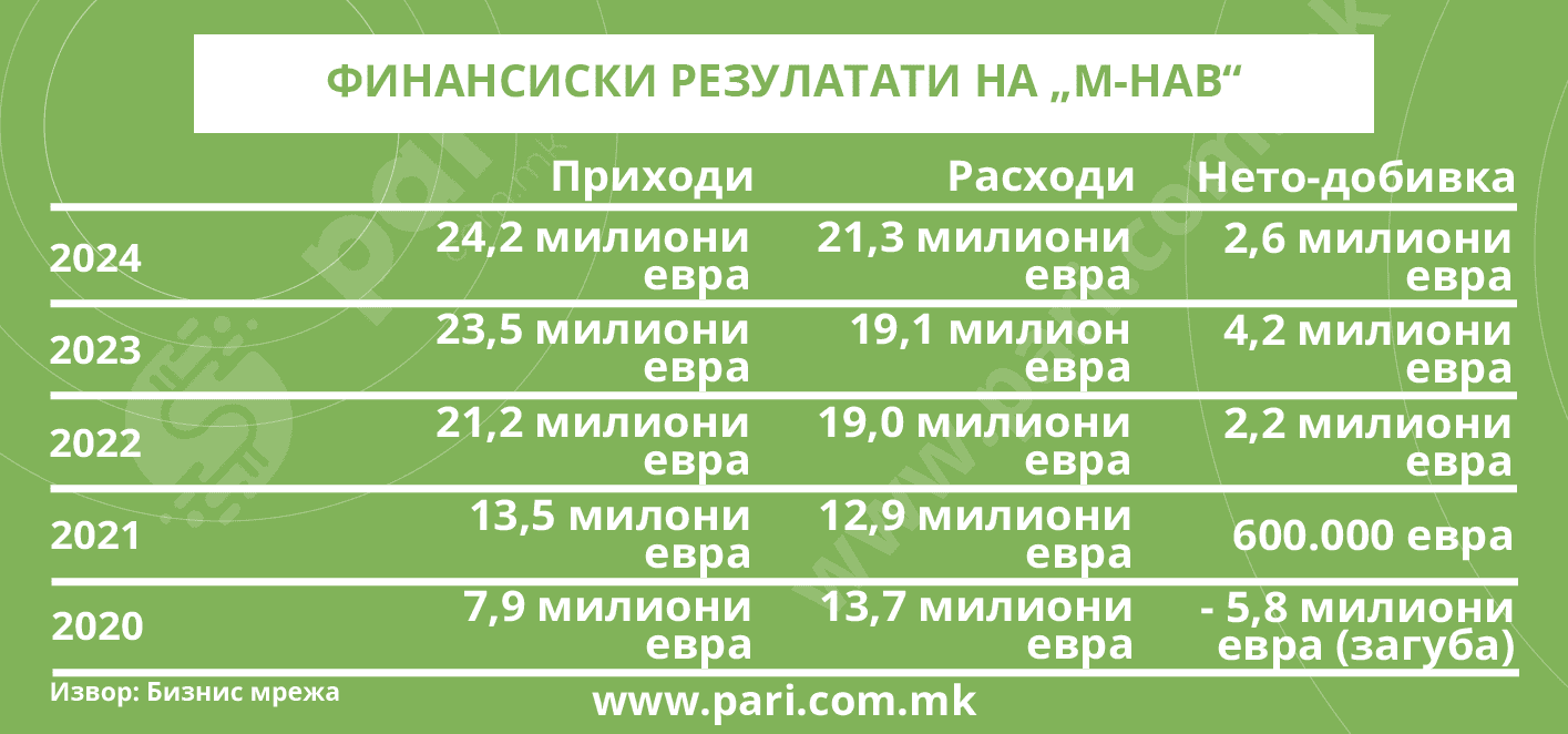 Минатата година, според податоците од Бизнис Мрежа, добивката на М-НАВ била 2,6 милиони евра. Влезните приходи, пак, изнесувале 24,25 милиони евра, а расходите на компанијата изнесувале 21,35 милиони евра.