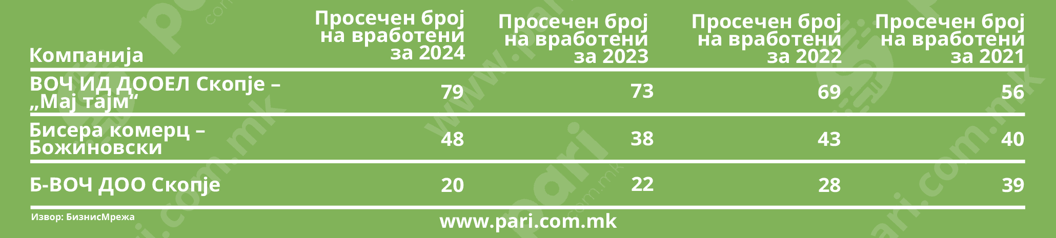 На другата страна, „Б-ВОЧ“ има голем пад кај бројноста на вработените – од 39 во 2021 на само 20 во 2024, што е намалување од 49 проценти. Во исто време, платата скромно пораснала од 341 евро во 2023 на 398 евра во 2024 година. Со тој просечен износ останува најниска меѓу овие компании, иако успева да одржи скромен, но стабилен профит.