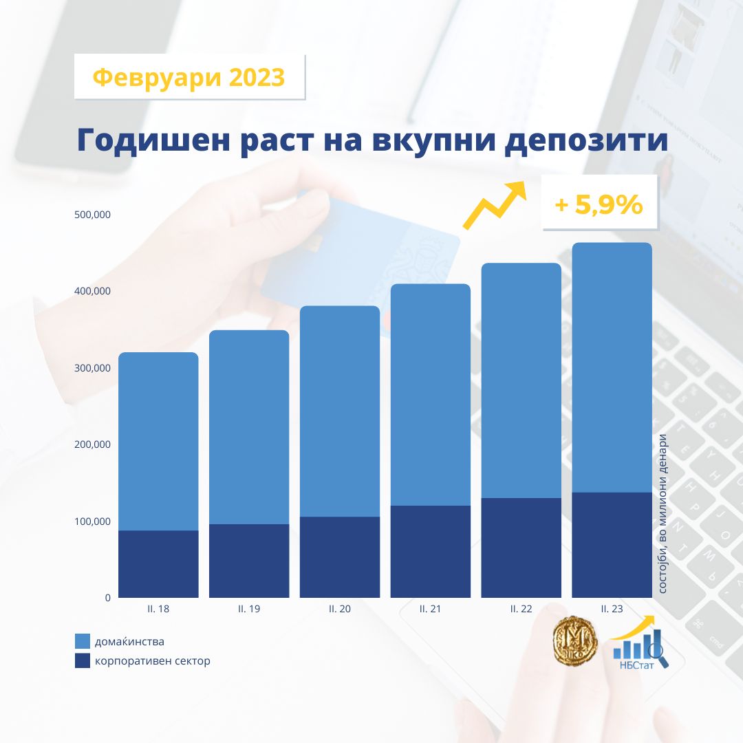 ‒ Кај вкупните депозити, во февруари, е забележан месечен раст од 0,9%, при годишен раст од 5,9%. Притоа, месечниот и годишниот раст се должи на зголемувањето на депозитите на двата сектора, коешто е поизразено кај секторот
